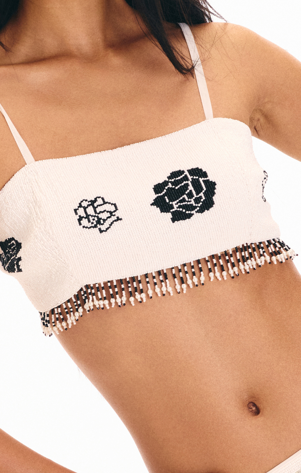 Named after the goddess of creation, power, and transformation, the Kali Set includes a straight-neck cropped top in monochrome beads. Hand-embroidered with intricate floral details and finished with a dainty handwoven beaded fringe that moves with you transformatively.