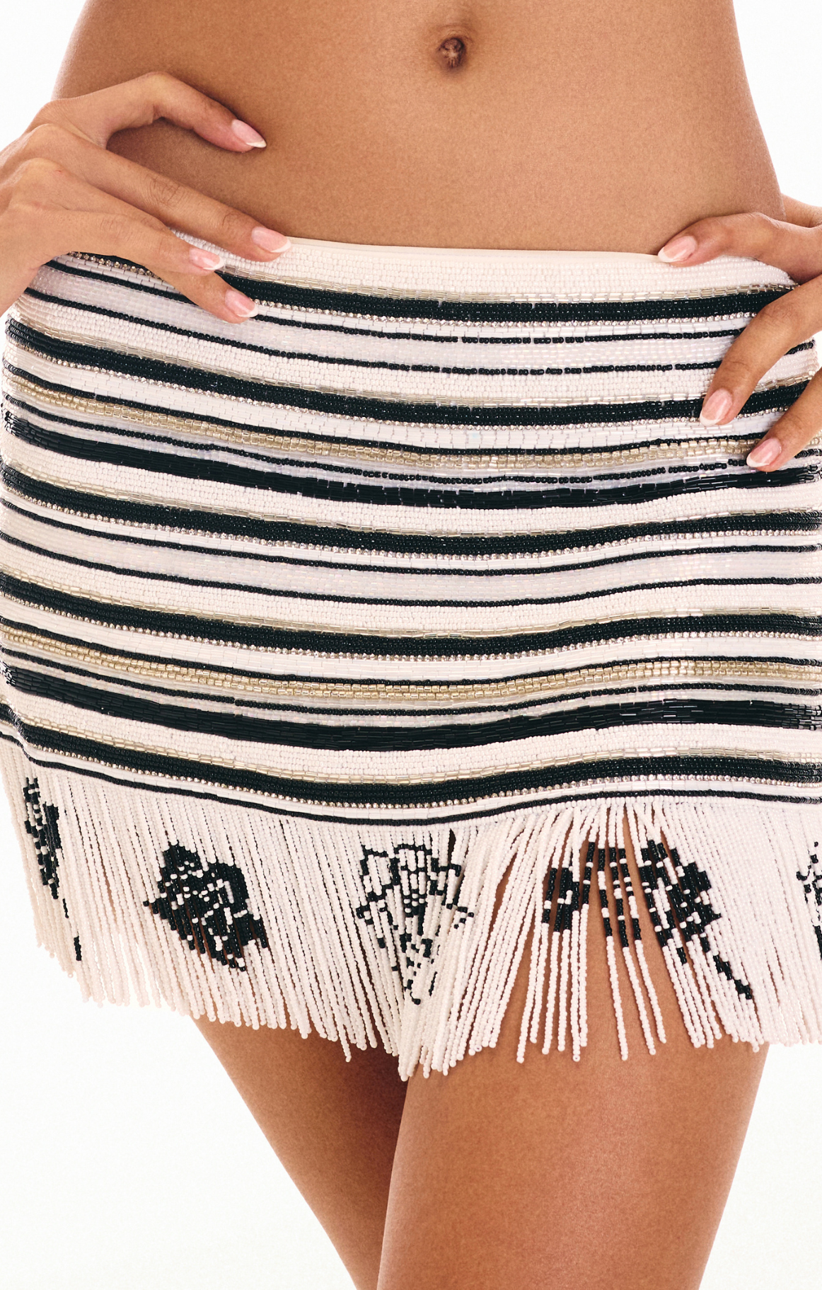 The matching low-rise skirt mirrors this energy, featuring rhythmic horizontal beaded stripes and complex floral embroidery along the cascading beaded tassel fringe. Each tassel on the skirt is woven by hand using a mathematically precise pattern, turning this piece into a living work of art. A hidden side zip on both the skirt and top gives it the perfect fit.