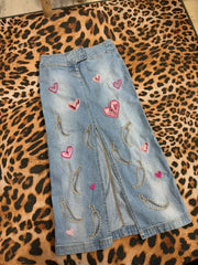 Saira is a one-of-one, rhinestone studded skit. It has scattered pink heart appliqués in varying sizes across the front, each edged and filled with sequins. Curved chili motifs outlined in metallic beadwork snake across the leg, and the waistband is dusted with stone detailing.