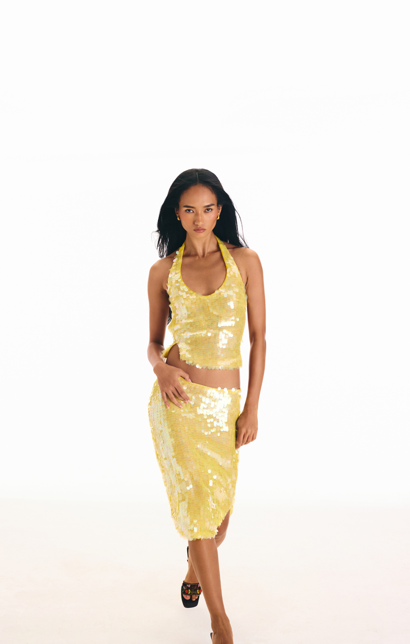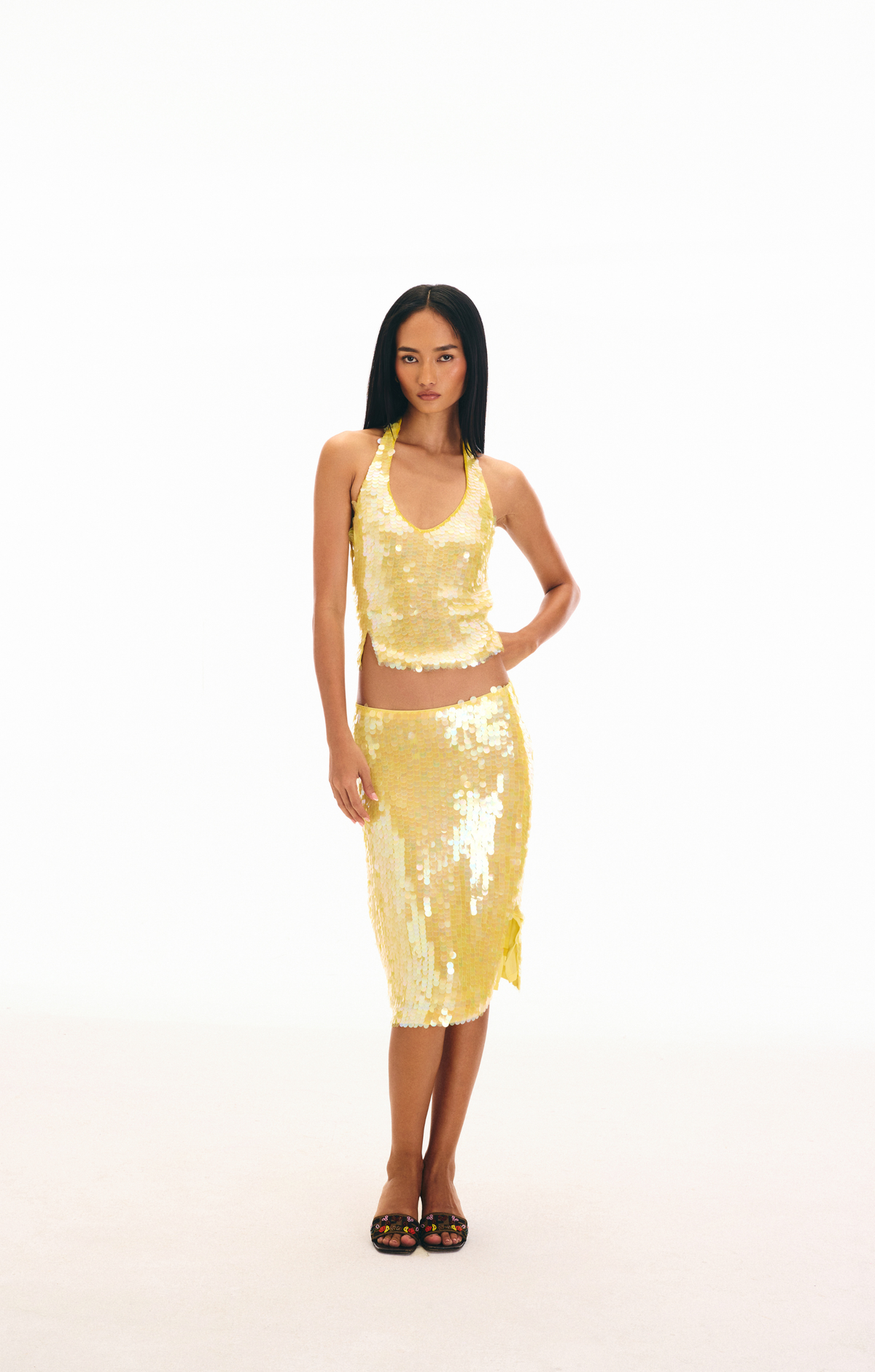 The Sol Set's top is drenched in the glow of yellow sequins, using a mix of sequins, beads, and cutdana work stitched together to create a stunning texture over soft double georgette fabric. It's finished with ties at the nape and back that have delicately designed hand-beaded tassel ends.